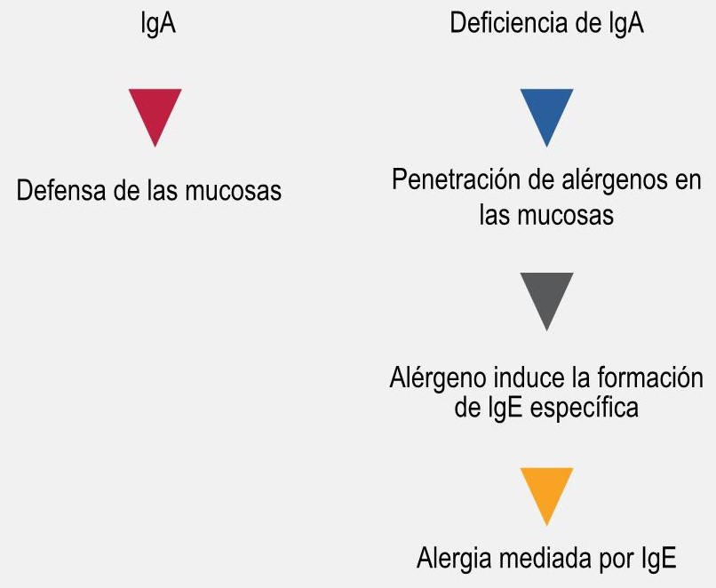 Lourenço y colaboradores8 sugieren que debido a la disminución en la cantidad de IgA, como ocurre en la deficiencia de IgA, hay mayor penetración de patógenos a través de las mucosas, contribuyendo a la sensibilización inhalatoria, que a su vez ocasiona cuadros frecuentes de asma y rinoconjuntivitis alérgica.