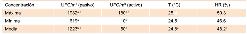 En este estudio, las concentraciones detectadas en algunos puntos del interior (180 y 155 UFC/m3 ) fueron significativamente mayores que las de áreas exteriores, donde la media fue de 80 UFC/m3. Lo anterior es indicativo de la existencia de microambientes originados por gradientes de temperatura, humedad relativa y ventilación en diferentes zonas del depósito. Estos microambientes pueden constituir reservorios de esporas y otros propágulos que pueden tener marcado carácter alergénico y convertirse en un factor de riesgo importante considerando la elevada dosis de alérgenos y el largo tiempo de exposición de los individuos que acceden al depósito durante la jornada laboral.