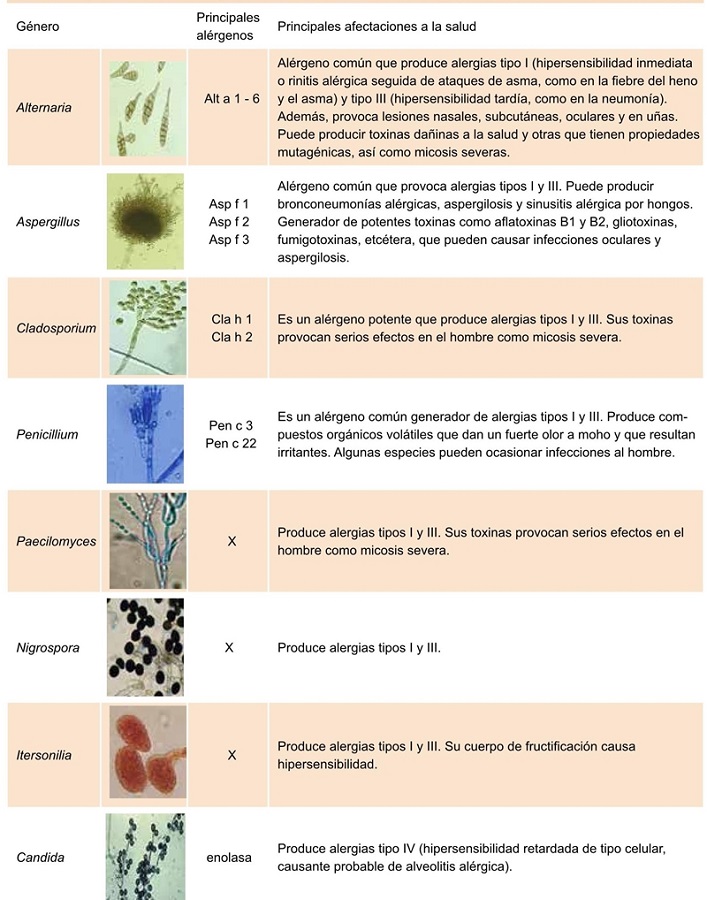 Es de amplio conocimiento que los representantes de Aspergillus spp., Cladosporium spp. y Penicillium spp. son productores de gran cantidad de antígenos de marcado carácter alergénico; estos pueden ser enzimas, toxinas y compuestos orgánicos volátiles (Cuadro 2). Por otra parte, algunos componentes de la pared celular de las esporas como glucoproteínas y ciertas proteínas de reacción cruzada de estructura altamente conservada filogenéticamente pueden ejercer efecto negativo aun sin que exista crecimiento activo o viabilidad.5