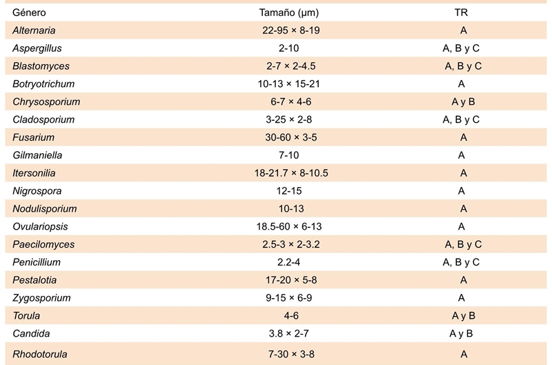 El resto de las esporas (42 %) son capaces de pasar a tráquea, bronquios y bronquiolos. Destacan en este grupo, géneros detectados con altas DR como Aspergillus, Cladosporium y Penicillium. Solo las esporas que presentan un tamaño inferior a 3 µm pueden penetrar a los alvéolos (26 %).