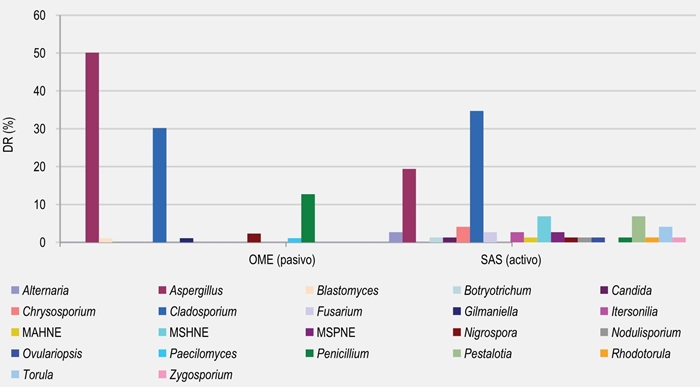 Fue evidente el predominio de representantes de los géneros Aspergillus y Cladosporium, con los mayores valores de densidad relativa. Fue notable también la presencia de Penicillium spp.