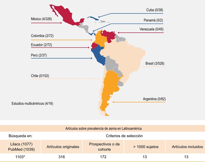 Se realizó una búsqueda sistemática de artículos en la base de datos de PubMed y Lilacs enfocada en identificar las investigaciones originales realizadas en Latinoamérica sobre prevalencia de asma. Las base de datos fueron revisadas por separado. La búsqueda se oriento a artículos en español e inglés que incluyeran las palabras clave “asma”, “prevalencia”, “frecuencia” y el nombre de países latinoamericanos (México, Argentina, Colombia, Brasil, Cuba, Venezuela, Chile, Bolivia, Costa Rica, Guatemala, Haití, Honduras, Uruguay, Paraguay, Perú, Salvador, Panamá, Nicaragua, Jamaica, República Dominicana y Belice).