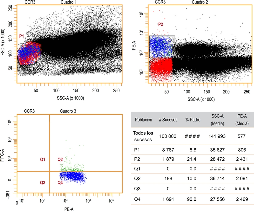 Se delimitó una región P1 sobre FSC versus SSC, en el área que comparten los linfocitos y los basófilos. Los basófilos se diferenciaron de los linfocitos por la marcación específica y se delimitaron en la región P2; la activación de los basófilos se delimitó en una tercera área denominada Q2 (Figura 1).