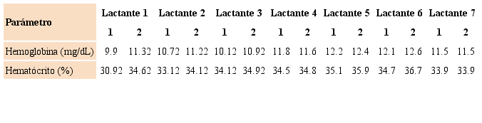 Los 7 lactantes iniciaron la investigación con valores de hemoglobina dentro de los rangos de referencia (entre 9 y 14.6 g/dL), sin embargo, 3 presentaron hematócrito por debajo (entre 34 y 38 %). Después de 2 meses de consumir la nueva fórmula, la hemoglobina continuó en niveles adecuados en los 7 lactantes y solo en uno el valor del hematócrito no mejoró. En ningún lactante bajaron los niveles de hemoglobina o hematócrito mientras recibió la FI (Cuadro 1).