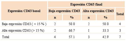 En el Cuadro 2 se muestra que antes de iniciar el estudio, la expresión del CD63 con la nueva fórmula fue baja (< 15 %) en 57.1 % de los lactantes (4 de los 7) y alta en 42.9 % (> 15 %); al finalizar siguió baja en 57.1 % y alta en 42.9 %. Con la chi cuadrada no hubo diferencias estadísticamente significativas en la expresión del CD63 antes ni después del estudio (prueba de McNemar: significación exacta de 1.0). Ningún lactante manifestó síntomas de reacción alérgica como dermatitis atópica, erupciones, distensión abdominal o problemas respiratorios relacionados o no con la PLV.