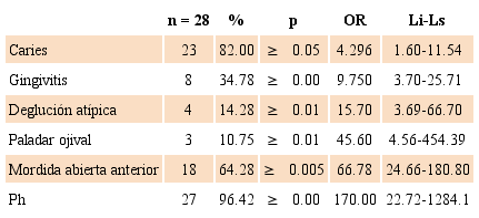 Results: In a population of 409 children, a prevalence of asthma of 6.84% (n = 28) was found, which was higher in males (15, 54%); boys aged 6, 7 and 11 years and girls aged 8, 9 and 10 years were most affected. Risk factors for oral manifestations were acidic pH (OR = 170), caries (OR = 4.29), anterior open bite (OR = 66.78), gingivitis (OR = 9.75), atypical swallowing (OR = 15.70) and high-arched palate (OR = 45.60).