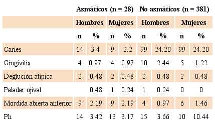 Se efectuó un estudio con una población total de 409 niños entre los 6 a 12 años; se encontró una prevalencia de asma de 6.84 % (n = 28), mayor en los hombres (54 %) que en las mujeres (46 %); los niños de 6, 7 y 11 años fueron los más afectados en los hombres y las niñas de 8, 9 y 10 años en las mujeres. En las alteraciones bucodentales observadas en los pacientes resultaron caries, gingivitis, deglución atípica, paladar ojival, mordida abierta anterior y pH (Cuadro 1).