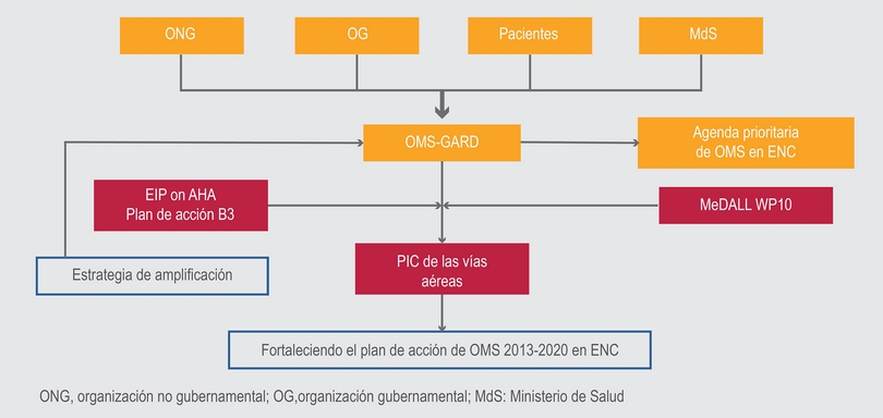 Airways ICPs (Vías integradas de atención para las enfermedades respiratorias) es la herramienta de implementación del proyecto; su principal actividad es el desarrollo de vías de atención multisectoriales para la rinitis, el asma y sus múltiples morbilidades, mediante tecnologías emergentes en medicina predictiva a lo largo del ciclo de vida del paciente.7,8,10 El objetivo es reducir la carga crónica de las enfermedades respiratorias, la mortalidad y la multimorbilidad, manteniendo al mismo tiempo la calidad de vida.7,11 El plan de acción de Airways ICPs se ha implementado y ampliado a escala mundial.12 Además, Airways ICPs es un proyecto de demostración de la Alianza Global contra las Enfermedades Respiratorias Crónicas de la Organización Mundial de la Salud (GARD) (Figura 1). ARIA 2016 es un componente importante de Airways ICPs.13