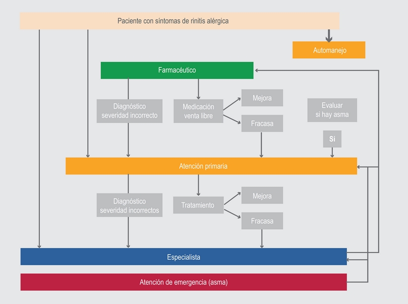 Aun cuando la rinitis alérgica afecta negativamente la vida social, escolar y productividad laboral,3 un gran número de pacientes con rinitis alérgica autocontrolan su enfermedad y se autorrecetan debido al acceso a numerosos medicamentos de venta libre;14,15.16,17 la mayoría de los pacientes que consultan a los médicos generalistas o especialistas padecen una rinitis moderada a grave.18,19,20 Además, los pacientes también pueden optar por la medicina alternativa o la inmunoterapia alérgeno específica.21 Es por ello que las vías de atención integradas (IPCs) deberían considerar un enfoque multidisciplinario que incluya el automanejo, como fuera propuesto por Airways ICPs (Figura 2).