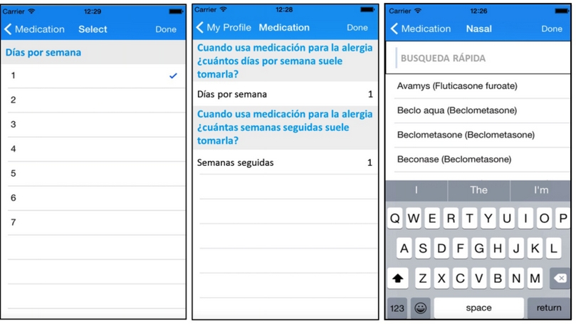 Una lista de todos los tratamientos disponibles para el asma, la conjuntivitis y la rinitis está incluida en el Diario de alergia ARIA y los usuarios seleccionan el o los tratamientos que están tomando. Pueden seleccionar múltiples tratamientos y actualizar la información cuando hay cambios al respecto (Figura 3).