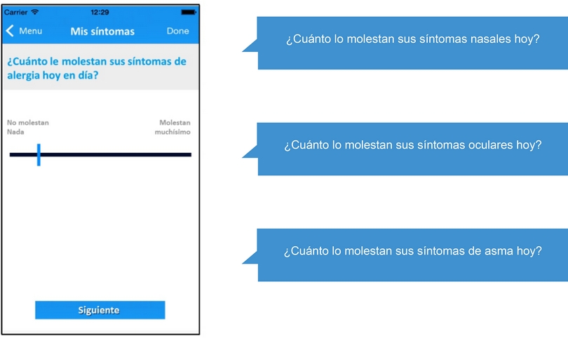 Los usuarios geolocalizados evalúan su control diario de los síntomas a través de la funcionalidad de la pantalla táctil en su teléfono inteligente después de contestar 5 EVA consecutivas (síntomas globales debido a enfermedades alérgicas, rinitis, conjuntivitis, asma y productividad laboral) (Figura 4).