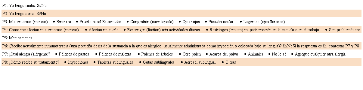 Al registrarse, los usuarios del Diario de alergia ARIA completan cuestionarios simples sobre asma, rinitis y el impacto de la enfermedad (globalmente, en el trabajo, en la escuela, en las actividades diarias y en el sueño) (Cuadro 1). El estudio piloto, que incluye alrededor de 5000 usuarios (9 % mayores de 60 años), indica que estas preguntas son fáciles de responder y pueden ayudar a estratificar a los pacientes con rinitis.28