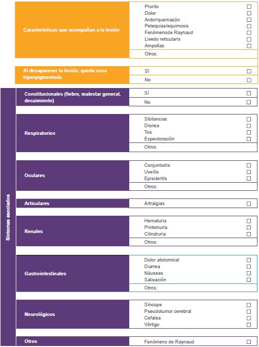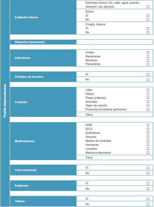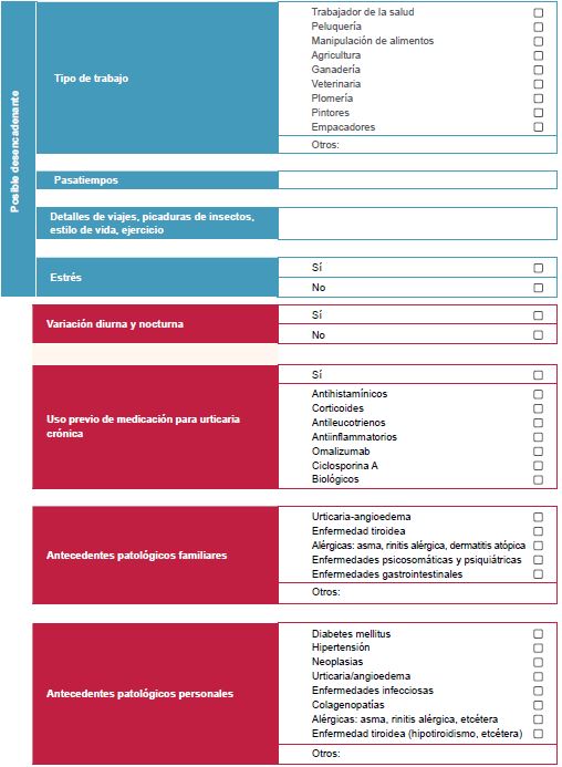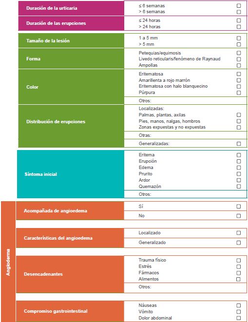 La lista de verificación y la guía de historia clínica para la urticaria crónica (Anexos 1 y 2) consta de lo siguiente: