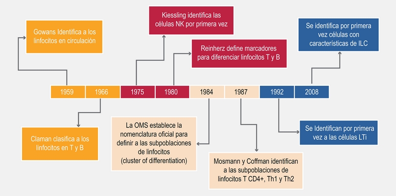 En 2008 se describieron unas células parecidas a las NK, cuya principal función era la producción de IL-22;19,20 se les dio el nombre de células NK22.20 Una caracterización más detallada de las células NK22 reveló similitudes fenotípicas con las células LTi, pues eran CD45+, CD4+ y CD3−, carecían de TCR o BCR y expresaban receptores de activación típicos de las células NK. Otros estudios sobre células con estas mismas características les dieron los nombres de linfocitos naturales,21 nuocitos22 o células cooperadoras innatas tipo 2 (Ih2);23 finalmente, debido a la similitud de sus funciones con las de los linfocitos de la respuesta inmune adaptativa, recibieron el nombre de ILC (Figura 1).10