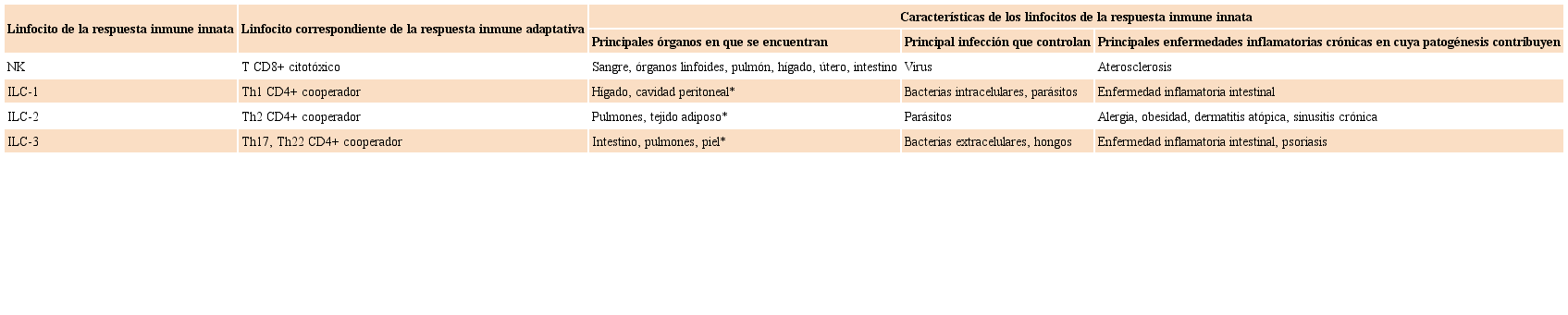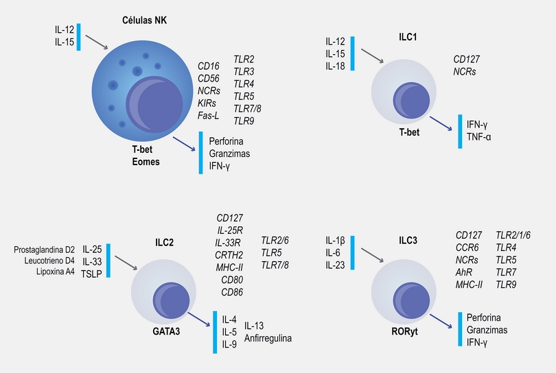 ILC-1, ILC-2 e ILC-3 corresponden, según los factores de transcripción que requieren para su desarrollo y el perfil de citocinas que producen, con los linfocitos Th1, Th2 y Th17 de la respuesta inmune adaptativa. Al igual que ocurre con los linfocitos T, los distintos grupos de ILC presentan un alto grado de plasticidad; es decir, el fenotipo de las ILC no es estable y puede cambiar bajo la influencia del medio. En el Cuadro 1 y Figura 2 se resumen las principales características de las células NK y las ILC.
