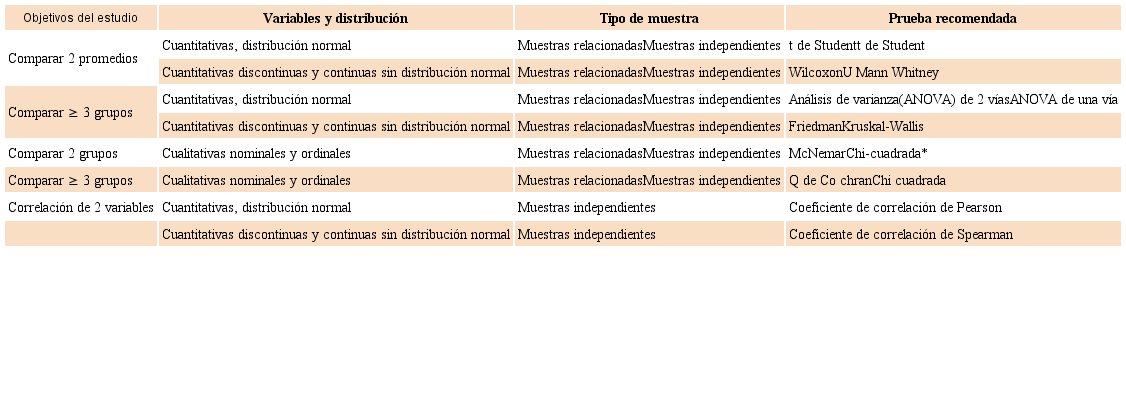 En el Cuadro 1 se resume la manera de selección de las pruebas estadísticas, tomando en cuenta el objetivo, número de grupos y la escala de medición de las variables. Como parte del análisis global de los datos nunca debe omitirse la inclusión del análisis descriptivo de los datos, es decir, es necesario que los investigadores resuman cada una de las variables estudiadas en medidas de tendencia central y de dispersión, tomando en cuenta la escala de medición de las variables y su distribución. De esta forma, las variables cualitativas habitualmente se presentan como frecuencia simples y proporciones (o porcentajes). El promedio como medida de tendencia central y la desviación estándar (o desviación típica) como medida de dispersión solo aplica con variables cuantitativas continuas y que tengan distribución normal; en variables cuantitativas discontinuas o continuas que no tienen dispersión normal se deben expresar como mediana y rango intercuartilar (también es correcto el valor mínimo y el valor máximo), respectivamente.1,4