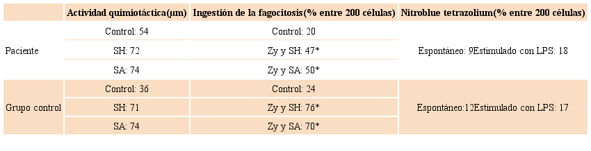 Para quimiotaxia fueron realizados 3 ensayos: neutrófilos incubados con 75 µg/mL de lipopolisacárido bacteriano (LPS), neutrófilos incubados con LPS y suero de pacientes saludables (suero homólogo) y neutrófilos incubados con LPS y suero del propio paciente (suero autólogo). Después de incubación por 2 horas a 37 °C y 5 % de CO2 fue determinada la distancia de migración de los 3 ensayos: 54, 72 y 74 µg. Para la etapa de ingestión de la fagocitosis fueron realizados ensayos análogos: neutrófilos, neutrófilos incubados con partículas de zymosan y suero homólogo; neutrófilos, zymosan y suero autólogo. Después de 60 minutos a 37 ºC y 5 % de CO2 fue determinado el número de neutrófilos que contenían 3 o más vacuolas fagocíticas, observándose 20, 47 y 50 %, entre un número fijo de 200 neutrófilos.4,5,6