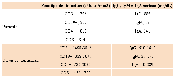 Los exámenes para linfocitos e inmunoglobulinas fueron realizados por técnicas convencionales. Los resultados de IgG, IgM, IgA y de linfocitos CD3, CD4, CD8 y CD19 se presentaron dentro de los parámetros de referencia para cada grupo de edad (Cuadro 2).2,3