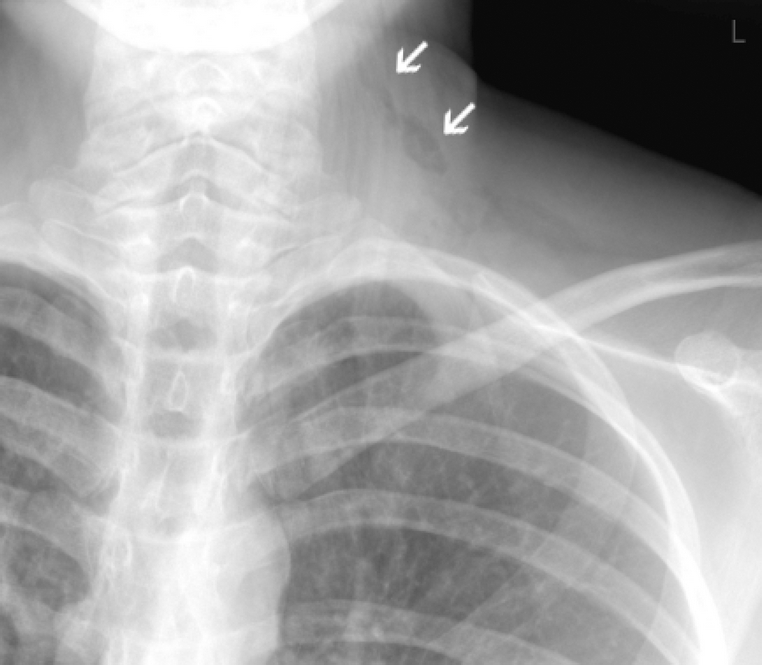 El electrocardiograma mostró evidencia de arritmia sinusal, sin datos de sobrecarga del ventrículo derecho ni cambios del segmento ST. La prueba de PCR en tiempo real, realizada únicamente contra el virus de la influenza A H1N1, fue negativa. En la radiografía de tórax, en proyección posteroanterior, se observó aire libre en el mediastino (Figura 1), así como en la cara lateral izquierda del cuello (Figura 2). Al día siguiente de su hospitalización se agregó dolor torácico, que se incrementaba en la inspiración.