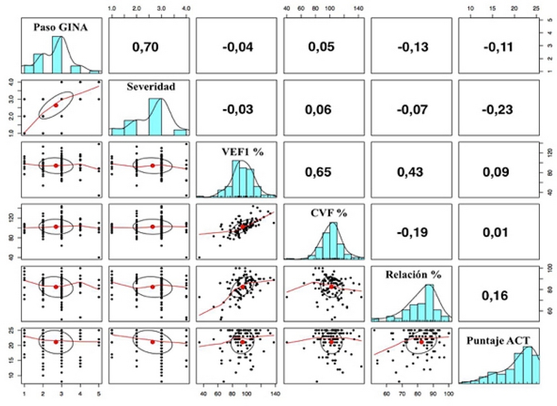 Para la correlación entre la gravedad del asma según los resultados de la espirometría y la puntuación ACT se utilizó una matriz de correlación que permitió observar el gráfico de dispersión, la distribución de datos y el coeficiente de correlación de rho de Spearman.