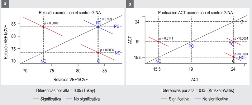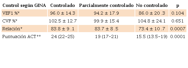 Hubo relación directa entre la relación (VEF1/CVF) y el control establecido en GINA (p = 0.0007) con valores menores en el grupo de pacientes no controlados (Cuadro 4). Al evaluar el control de acuerdo con la puntuación ACT y GINA hubo una correspondencia entre los resultados (Cuadro 4 y Figura 2).