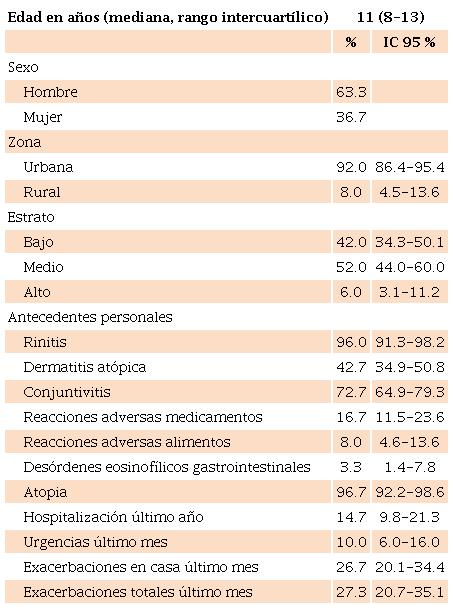De 174 pacientes candidatos para el estudio, por criterios de selección fueron elegidos 150; 24 fueron excluidos dado que se carecía de información esencial para el análisis o no asistieron a la cita asignada para la realización de la prueba cutánea y los cuestionarios. Las características de base de la población de estudio se describen detalladamente en el Cuadro 1. El 96.7 % (n = 145) de los pacientes incluidos fue atópico, de esa proporción 33.8 % estaba monosensibilizados y 66.2 % polisensibilizado. El 85.3 % tenía su vivienda ubicada en estratos socioeconómicos 1 a 3 y 14.7 % en estratos 4 a 6.