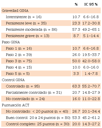 De acuerdo con la clasificación de gravedad de GINA,14 57.3 % (n = 86) de los pacientes tenía asma persistente moderada (Cuadro 2). El 50 % (n = 75) se encontraba en el paso 3 de tratamiento, 36.7 % en el paso 1 o 2 y 13.3 % en paso 4 o 5.