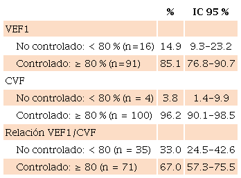 Ciento seis pacientes tenían el resultado de la espirometría. A 44 no se les realizó por diversos motivos, entre ellos incapacidad para realizar la prueba, disponibilidad de tiempo y problemas administrativos, entre otros. De acuerdo con la espirometría, 85.1 % de los pacientes tenía VEF1 > 80 % y 96.2 % tenía una CVF > 80 %. La relación VEF1/CVF fue mayor a 80 % en 67 % de los pacientes (Cuadro 3).