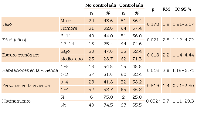 El estrato económico bajo (niveles 1, 2 y 3) se asoció con falta de control de la enfermedad; 47.6 % de los pacientes con estrato económico bajo carecía de control de la patología, frente a 28.7 % en los estratos medio y alto. Los pacientes con edades comprendidas entre los seis y 11 años tenían menor control (44 %) en comparación con el grupo de pacientes de 12 a 14 años (25.4 %).