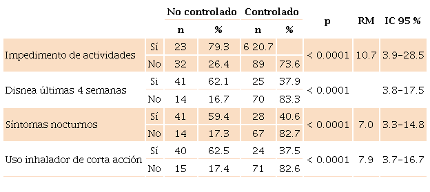 Los pacientes con enfermedad no controlada presentaron mayor impedimento en las actividades, reflejado en un mayor número de episodios de disnea en las últimas cuatro semanas, síntomas nocturnos y uso de inhaladores β2 agonistas de corta acción, respecto a los pacientes con enfermedad controlada (Cuadro 6).