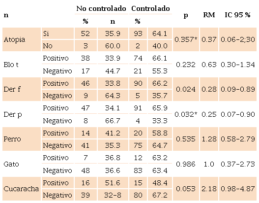 La sensibilización a Der f y Der p fue mayor en el grupo de pacientes con control del asma (Cuadro 7), mientras que la sensibilización a cucaracha fue mayor en el grupo no controlado. Al realizar el análisis multivariado no se encontró que la sensibilización a Der f y Der p fuera un factor de riesgo, pero la sensibilización a cucaracha estuvo asociada con no control del asma (OR, 3.27; IC, 1.08-9.89; p, 0.03). Otros alérgenos intradomiciliarios como epitelio de perro y epitelio de gato no mostraron diferencias significativas entre los grupos controlado y no controlado.
