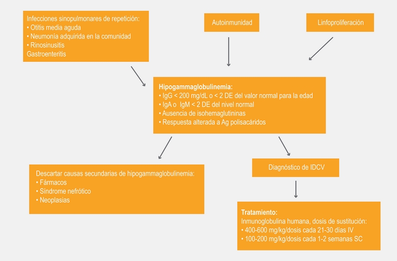 El diagnóstico de IDCV es de exclusión y debe considerarse en cualquier grupo edad con hipogamma-globulinemia sin causa conocida.