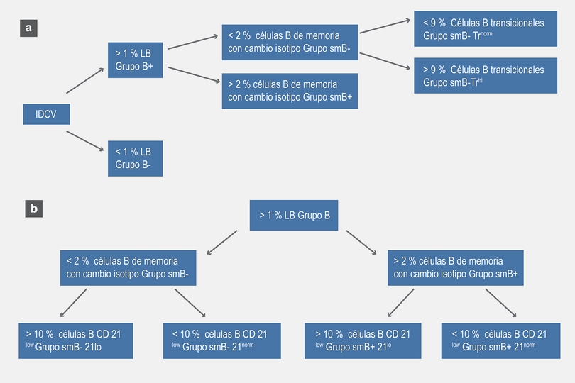 Dos grupos de estudio en IDCV son pioneros en estas clasificaciones utilizando algoritmos similares; el realizado por el grupo alemán, Freiburg, que estableció la clasificación con el mismo nombre, y el realizado por Piqueras et al., que constituye la Clasificación de París. Estos algoritmos fueron combinados para realizar el esquema EUROclass, en un intento por unificar criterios de clasificación de los pacientes con IDCV. Este requiere la medición de los siguientes subtipos de células B: células B totales, células B de memoria IgD- IgM-, células B transicionales y células B CD21low. Y establece dos grupos principales: B+ con más de 1 % de células B y B- con menos de 1 % de células B. El grupo B+ puede subdividirse a su vez en dos, para identificar a los pacientes con un defecto severo en la generación de células B de memoria: smB+ con más de 2 % de células B de memoria con cambio de isotipo y smB- con menos de 2 % de células B de memoria con cambio de isotipo. A su vez, se pueden subdividir nuevamente de acuerdo con las concentraciones de células CD21lowque presenten. Y el grupo de pacientes smB- pueden subdividirse en dos grupos de acuerdo a si presentan valores normales o altos de células B transicionales: smB- Trhicon más de 9 % de células B transicionales y el grupo smB- Trnorm, que presentan menos de 9 % de células B transicionales (Figura 2).12,13