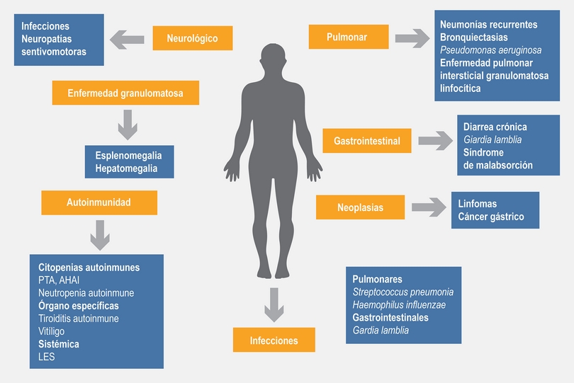 Clínicamente se pueden agrupar a los pacientes en cuatro categorías: otras complicaciones relacionadas con la enfermedad, citopenias, linfoproliferación policlonal (granulomas, neumonía linfocítica intersticial, linfadenopatías persistente inexplicable) y enteropatía de causa desconocida. Las últimas tres categorías se asocian con disminución en la supervivencia, mientras que la ausencia de comorbilidades representa un factor de buen pronóstico.14