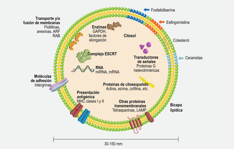 Dentro del proteoma de exosomas se han logrado identificar proteínas citoplásmicas, nucleares, endosomales y membranales.34,35,36 Dentro de estas destacan moléculas típicamente asociadas con tránsito vesicular (Rab GTPasas, SNARE, flotillina y anexinas), proteínas involucradas en la biogénesis exosomal (miembros del complejo ESCRT, ALIX, TSG101, etcétera), tetraspaninas (CD9, CD63, CD81, etcétera), proteínas de choque térmico (HSP70, HSP90, etcétera) y moléculas de histocompatibilidad, tanto de clase I como de clase II.37 Cabe resaltar que los exosomas funcionan importantemente como acarreadores de mediadores solubles tales como las citocinas, una función particularmente relevante para la comunicación intercelular en el sistema inmunológico.38