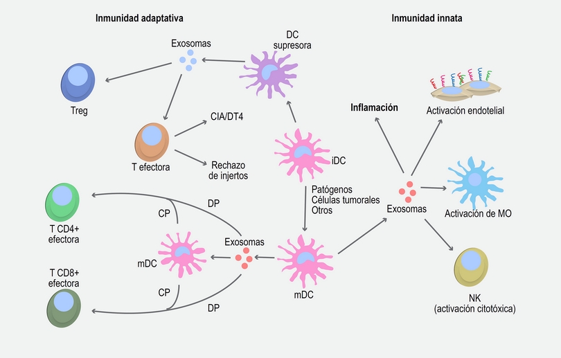 En años recientes, el uso de DC con fines inmunoterapéuticos para el cáncer y diversas enfermedades con algún componente inflamatorio se ha extendido, sin embargo, la factibilidad de los tratamientos basados en este enfoque se ha visto comprometida debido a las dificultades intrínsecas derivadas del uso de dichas células. En el presente escenario, los exosomas de DC adquieren relevancia debido a su facilidad relativa de manipularse y adaptarse a los procesos regulados de manufactura y almacenaje a largo plazo requeridos o deseados. Adicionalmente, la administración de exosomas reduce enormente los riesgos y complicaciones potenciales derivados de la introducción de células exógenas (o propias pero manipuladas ex vivo) a un individuo dado.11