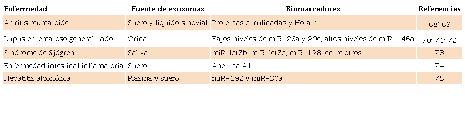 Por otra parte, los exosomas, y particularmente su contenido, pueden ser empleados como biomarcadores para enfermedades inflamatorias. La presencia de exosomas en diversos fluidos corporales, una composición rica en proteínas, diversos RNA y lípidos característicos, así como la plasticidad mostrada por su contenido en respuesta a diversos estímulos hacen de estas vesículas un elemento biomarcador de alteraciones en el estado de salud de un individuo. La utilidad potencial de estas vesículas como fuente de biomarcadores en enfermedades inflamatorias se refleja en los datos mostrados en el Cuadro 1.