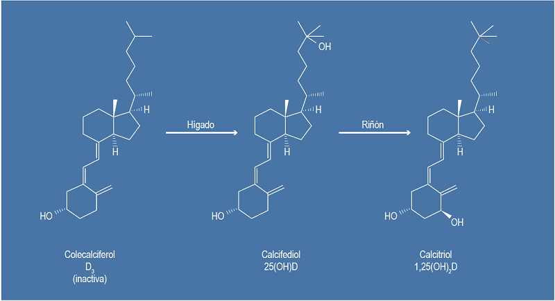 La vitamina D es uno de los nutrientes importantes sintetizados por el ser humano, para lo cual es necesaria la luz ultravioleta proveniente del sol. Por tanto, a diferencia de otros compuestos esenciales para el organismo, su principal fuente no son los alimentos. Hablar de vitamina D es referirse a un grupo de compuestos liposolubles, entre los más importantes están la vitamina D3 (colecalciferol) y la vitamina D2 (ergocalciferol). Ambas formas son biológicamente inactivas hasta que son dihidroxiladas en primera instancia por el hígado y posteriormente por el riñón. En el caso del colecalciferol, la primera hidroxilación produce el 25-hidroxicolecalciferol (25(OH)D), conocido también como calcifediol, el cual es un indicador del estatus de la vitamina D en el organismo.20 La hidroxilación del calcifediol por el riñón produce 1,25-dihidrocolecalciferol o calcitriol (1,25(OH)2D), el cual es la forma activa más potente de la vitamina D (Figura 1).21),(22