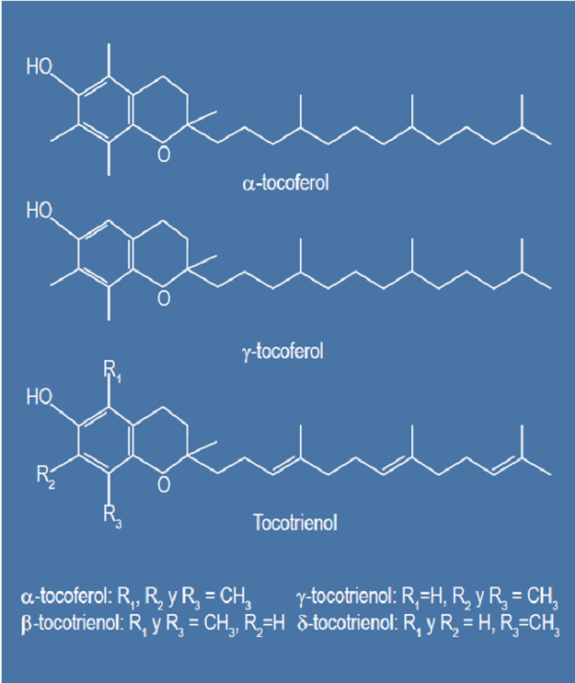 La vitamina E comprende un conjunto de ocho compuestos liposolubles, cuatro de los cuales son los tocoferoles α, β, γ y δ. Los otros cuatro compuestos son tocotrienoles α, β, γ y δ. Todos presentan propiedades antioxidantes.51 La forma más abundantemente distribuida en la naturaleza es el α-tocoferol (Figura 3).