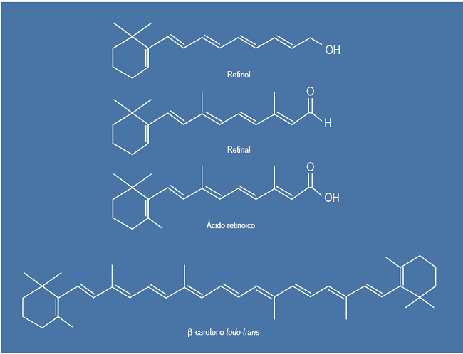 La vitamina A es una vitamina liposoluble que posee tres formas activas: retinol, retinal y ácido retinoico, a estas en conjunto se les denomina retinoides (Figura 4). Existen también los compuestos denominados provitamina A, definidos como carotenoides, entre los que destaca el β-caroteno6 que puede ser transformado en vitamina A. Esta se acumula en las membranas celulares y subcelulares, en las que tiene una función esencial para mantener su estabilidad, influye en el crecimiento y reparación de las células epiteliales y al ser un antioxidante, elimina al anión superóxido y reacciona directamente con radicales hidroperoxilo, además evita la peroxidación lipídica de las membranas. Los carotenoides obtenidos de la dieta se han asociado con una función pulmonar mejorada y menor prevalencia de asma.12 Esta mejora en el asma se debe no solo a la capacidad de neutralizar especies reactivas de oxígeno formadas en el pulmón por mediadores inflamatorios, sino a efectos directos en el sistema inmune, ya que esta vitamina disminuye la regulación de la respuesta inmune Th2 incrementando la proliferación de células T reguladoras e inhibiendo a las células Th17.2