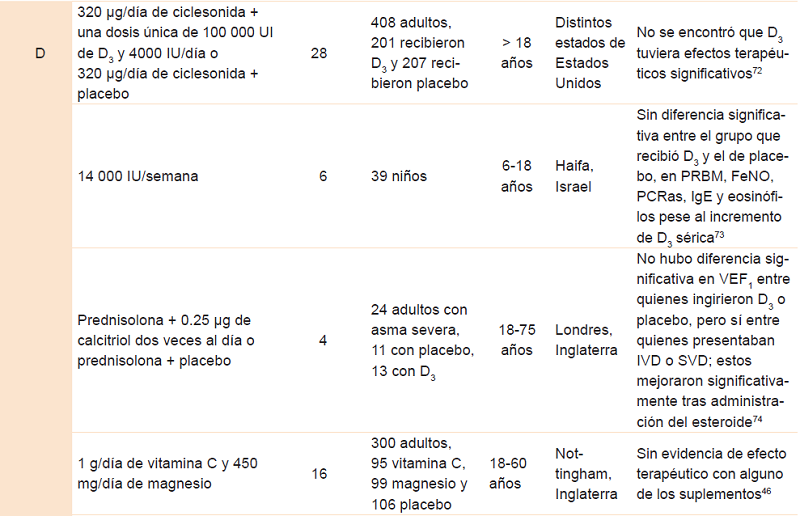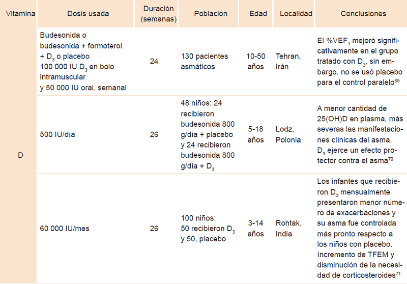 Aunque varios estudios sugieren mejoría en los síntomas del asma al administrar grandes dosis de vitamina D, se debe tener cautela al afirmar que esta es útil en el tratamiento del asma, pues en general los ensayos se han realizado con un número relativamente pequeño de pacientes y han sido de corta duración. Se requieren investigaciones con niveles controlados de vitamina D en las que se evalúe la asociación de niveles séricos y marcadores clínicos, inmunológicos y bioquímicos, con el nivel de remisión de los síntomas y signos y también con evolución de la función pulmonar.40