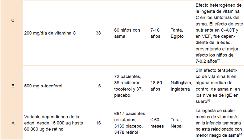 Se ha referido la no relación de la ingesta de algunas vitaminas con asma18 o, incluso, que la alta exposición a antioxidantes, entre ellos vitaminas, incrementa la susceptibilidad de padecer enfermedades alérgicas y asma al aumentar respuestas Th2 como resultado de la inhibición de la activación de Th1.12),(19) Allen et al. realizaron en 2009 un metaanálisis a partir de estudios observacionales, con el objetivo de determinar si existe una asociación entre ingesta de las vitaminas A, C y E o sus niveles plasmáticos con el asma y la severidad de esta. Se encontró que una baja ingesta, tanto de la vitamina A como de la C, está asociada con incremento en la probabilidad de sufrir asma. Por el contrario se encontró que la ingesta de vitamina E parece no estar relacionada con la enfermedad.18