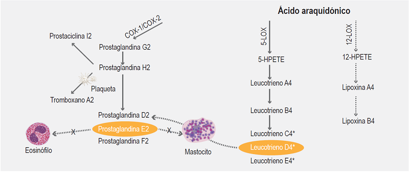 Se conoce que la prostanglandina (PG) E2, producto de la acción enzimática de la COX-1, actúa como un inhibidor de los eosinófilos y estabiliza los mastocitos mediante su receptor (receptor 2 de la PGE2).3),(6 Aunque los inhibidores de la COX lleven a depleción de esta, el factor responsable de la alteración en la activación de los mastocitos y la producción de los cisteinil leucotrienos (cysLT) en la EREA continúa siendo desconocido.