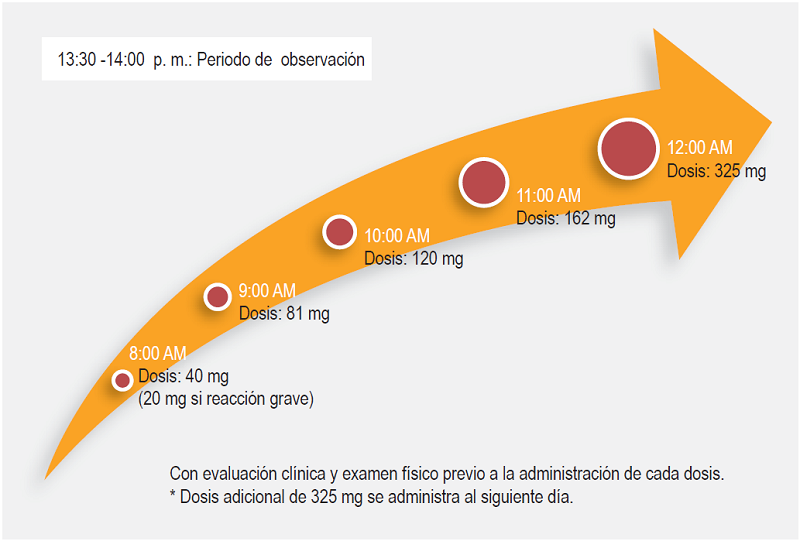 Idealmente, la desensibilización debe llevarse a cabo entre dos y cuatro semanas después de la polipectomía. Es un procedimiento con riesgo potencial de producir broncoespasmo, laringoespasmo, síntomas cutáneos y gastrointestinales, por lo que debe ser ejecutado por un médico especialista en el área y en un lugar adecuadamente equipado. Existen varios protocolos que se diferencian por los tiempos de intervalo entre dosis,59 generalmente se inicia con 20 a 40 mg de aspirina, la cual se va incrementando cada 90 minutos, durante un periodo de nueve horas hasta llegar a 325 mg sin que se presenten reacciones,8),(39),(47),(56),(63 dosis en la que el protocolo de desensibilización se completa como se ve en la Figura 2. La dosis óptima de mantenimiento no se ha establecido, pero debe ser individualizada en cada paciente.8),(39 Se recomienda que se alcance una dosis inicial de 1300 mg de aspirina (650 mg dos veces al día) durante un mes, al término del cual si hay mejoría de los síntomas se puede comenzar un descenso. Existen diferentes esquemas de reducción progresiva: se puede disminuir a una tableta de 325 mg mensualmente, pudiendo ser 650 mg en la mañana y 350 mg en la noche o 350 mg dos veces al día. (8),(39),(56 Los pacientes que no toleren el descenso presentarán empeoramiento de los síntomas en las dos semanas siguientes.9 Dosis de 81 mg pueden ser suficientes para mantener el estado de tolerancia en los pacientes que requieran cardioprotección, sin embargo, es una dosis subóptima para el control de la inflamación en la vía respiratoria.(8