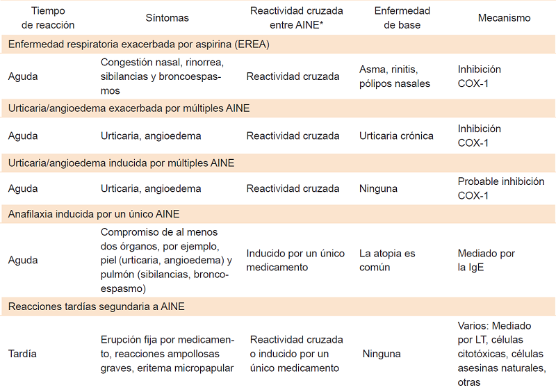 Los pacientes con EREA generalmente experimentan una variedad de síntomas que pueden ir desde congestión nasal, rinorrea, sibilancias y broncoespasmo, incluso síntomas cutáneos y gastrointestinales en un subgrupo de pacientes.(30 Usualmente se presentan entre 30 y 60 minutos (cuando se alcanza la concentración sistémica) y hasta tres horas posterior a la ingesta de dosis terapéuticas de aspirina u AINE3 tipo ibuprofeno, naproxeno, ketorolaco o de dosis altas de acetaminofén (> 1000 mg).15 En la mayoría de los casos, los inhibidores selectivos de la enzima COX-2 son bien tolerados, no obstante, existe un riesgo teórico con los inhibidores duales tipo meloxicam, especialmente a dosis altas.5