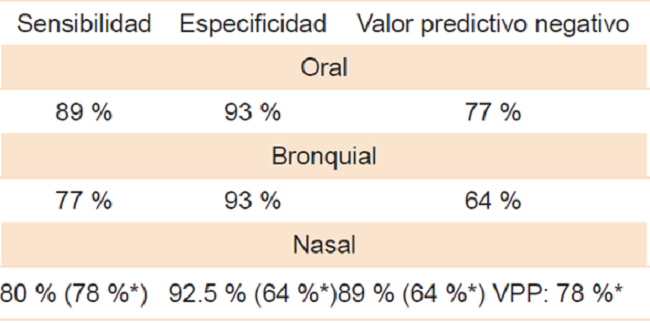 A la fecha no existen pruebas in vitro que permitan confirmar el diagnóstico;1),(35 por lo tanto, la prueba de oro confirmatoria continúa siendo la provocación con inhibidores de la COX-1.1),(2),(32),(35 Esta prueba de provocación se realiza principalmente con aspirina, aunque también existen protocolos con otros AINE como ketorolaco.30 La vía de administración puede ser oral, inhalación nasal, bronquial e intravenosa.34),(39 La sensibilidad, especificidad, valores predictivos positivos y negativos de estas pruebas varían según el método utilizado. La provocación oral tiene una sensibilidad de 89 % y una especificidad de 93 %, con un valor predictivo negativo de 77 %.40 En la provocación nasal estos valores cambian según el medicamento usado. La sensibilidad se encuentra entre 78 y 80 %, la especificidad entre 64 y 92.5 % y el valor predictivo negativo entre 64 y 89 % (cuadro 2).30),(41),(42