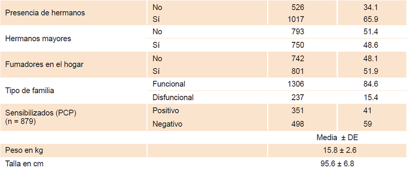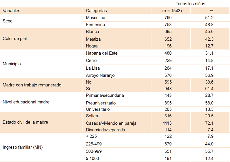 El objetivo del estudio inicial fue identificar las exposiciones ambientales que pudieran incrementar el asma y las enfermedades alérgicas en Cuba.9,10,11 La recolección de datos consistió en el cuestionario ISAAC con adición de algunas variables de interés por los investigadores, el cual fue aplicado por un entrevistador (pediatra o médico familiar) a padres o tutores. Se obtuvieron datos demográficos, características de los síntomas, estilo de vida, ambiente, tipo de familia (funcional y disfuncional), antecedentes prenatales y posnatales, obtenidos de la revisión de la historia obstétrica y clínica de los niños, así como mediciones antropométricas al momento de la entrevista. Los cuestionarios fueron 100 % llenados de forma correcta.