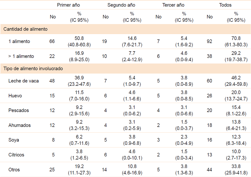 La leche de vaca fue el alimento más frecuentemente relacionado para desarrollar RAA. Resultados similares fueron encontrados en ensayos con base en evidencia nivel 1, donde la incidencia de AA osciló entre 2 y 5 %.27 Se conoce que características relacionadas con la dieta materna, prácticas de ablactación, dieta infantil, epigenética o factores del medio ambiente puede provocar variaciones respecto a las cifras encontradas en otros países, según la confirmación de un metaanálisis reciente.28
