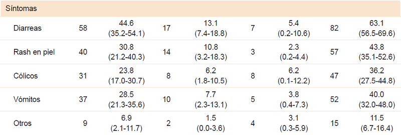 Fue suficiente la ingestión de un solo alimento para provocar la RAA en 70.8 %. La leche de vaca fue el alimento más involucrado con la RAA. Los síntomas más comúnmente referidos correspondieron al sistema gastrointestinal (Cuadro 2).