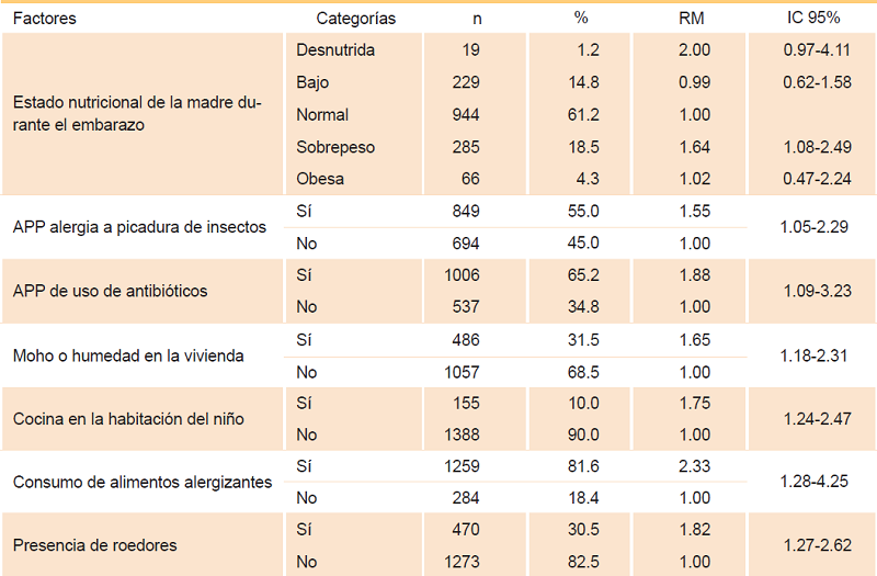 Luego del ajuste de los factores de confusión, los principales factores de riesgo identificados fueron el consumo de alimentos alergizantes durante el primer año de vida (RM = 2.33 [1.28-4.25], antecedentes personales de uso de antibióticos (RM = 1.88 [1.09-3.23]), presencia de roedores en la vivienda (RM = 1.82 [1.27-2.62]), presencia de la cocina en la habitación del niño (RM = 1.75 [1.24-2.47]), presencia de moho o humedad en la vivienda (RM = 1.65 [1.18-2.31]), sobrepeso de la madre durante el embarazo (RM = 1.64 [1.08-2.49]) y antecedentes personales de alergia a picadura de insectos (RM = 1.55 (1.05-2.29]) (Cuadro 3).